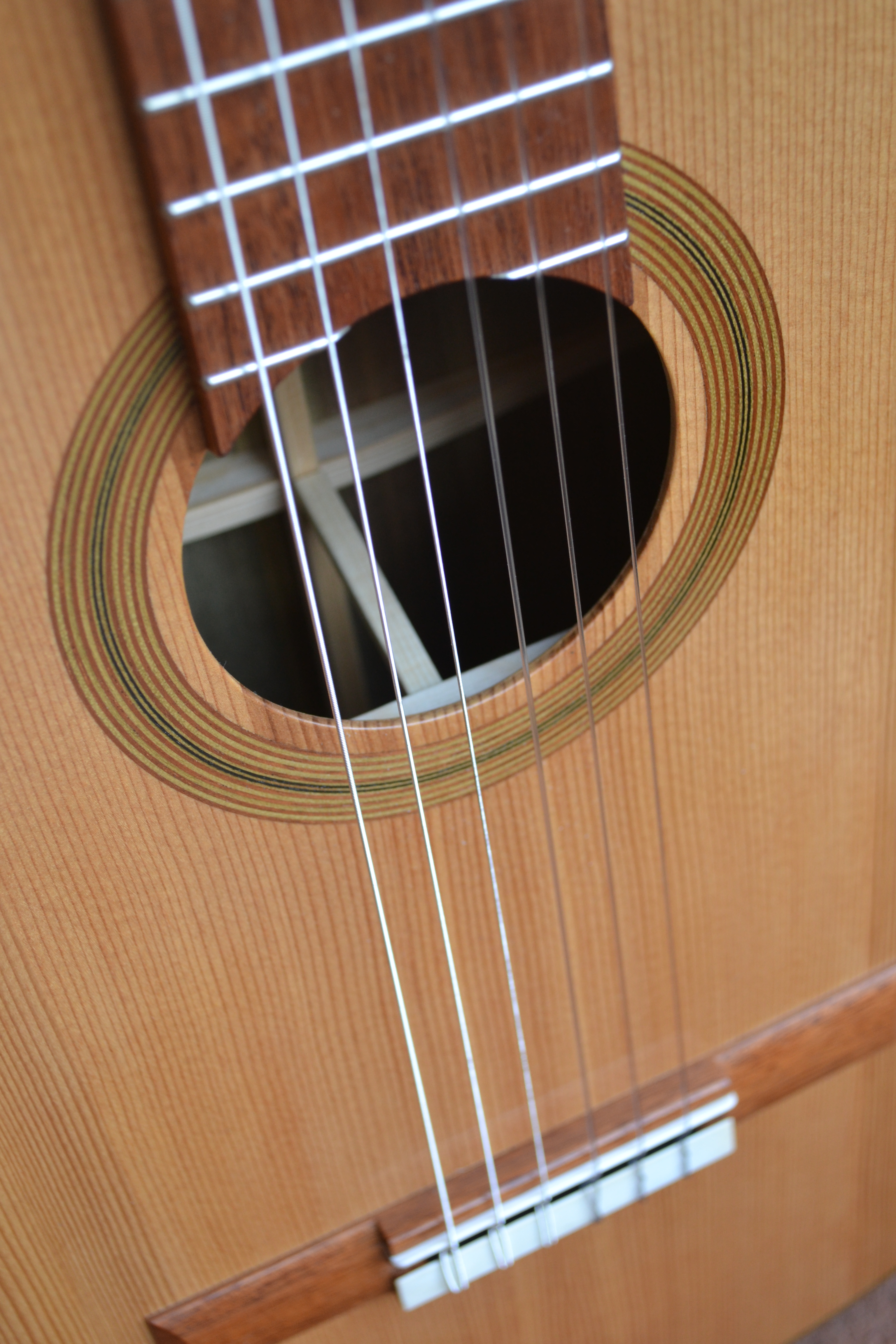 The sound post is not an integral part of the instrument, like that of the violin family, but is an addition which the player can use to subtly influence the sound of the guitar. A bit like using an electric guitar effects pedal. It has three main effects when positioned. Firstly it raises the air resonance by around one tone. My guitars which are relatively lightly built, have an air resonance of F#. This goes up to G# with the post installed. Secondly I find it enhances the mid range frequencies of the guitar, cutting off some of the lowest bass and highest treble frequencies. Thirdly it seems to give the decay of the notes a more linear quality.