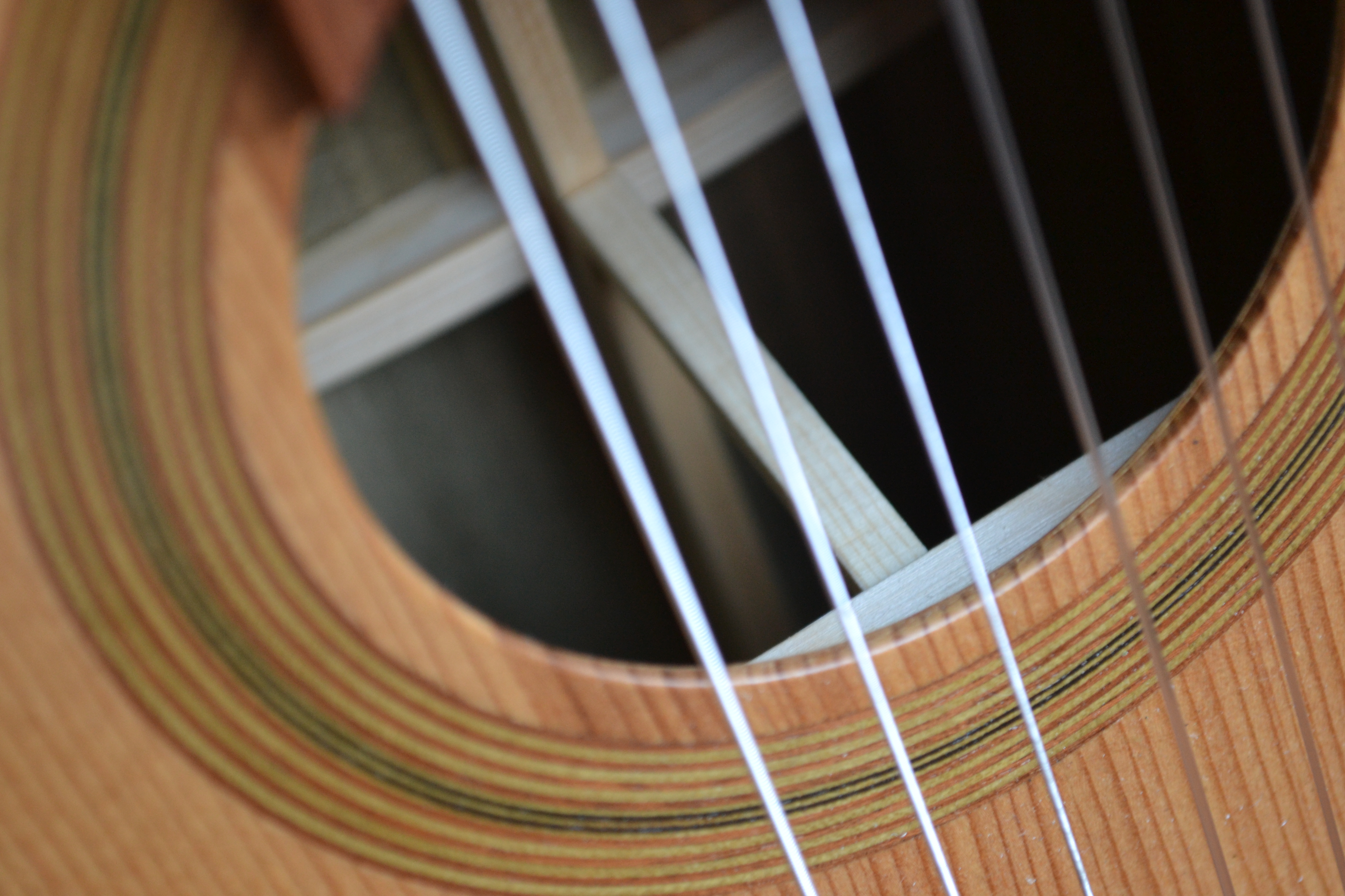 From the beginning of my guitar making career I have experimented with the use of a sound post in the guitar. My first attempts didn’t work but when I introduced a new way of strutting the back about five years ago, most of the issues I was having were resolved. The use of a raised longitudinal back bar, a method I copied from steel string makers, allowed the sound post to be easily positioned and limited the amount of dampening that had occurred in the past. I found that my lightweight Torres influenced guitars, with their quick response and warm rich tone, could have their character subtly manipulated with the addition of the post. All my guitars with the raised back bar can have a sound post fitted if the player wishes. In this page I will explain my thoughts to the effect it has and my method of installing one (see YouTube link for my video demonstration at the bottom of the page).